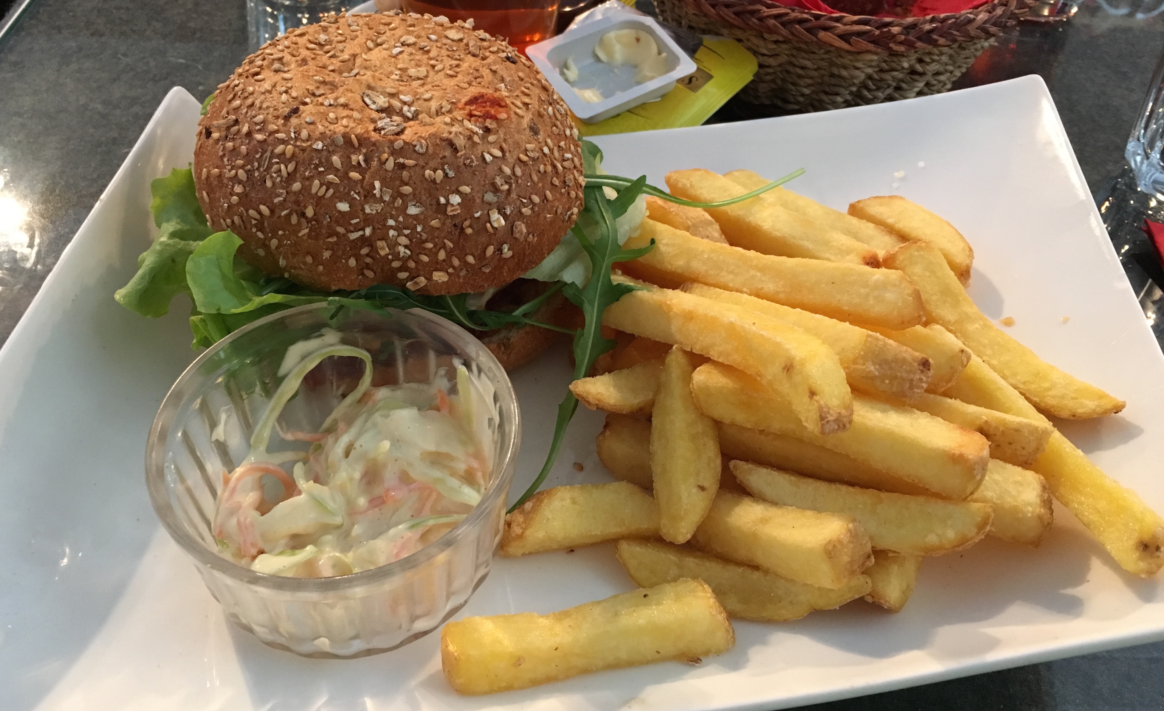 a beef burger and a chicken burger. Unfortunately the food wasn’t as good as we expected. The beef burger was quite dry and the chicken one was only a grilled chicken breast inside the buns. But the fries were quite good.