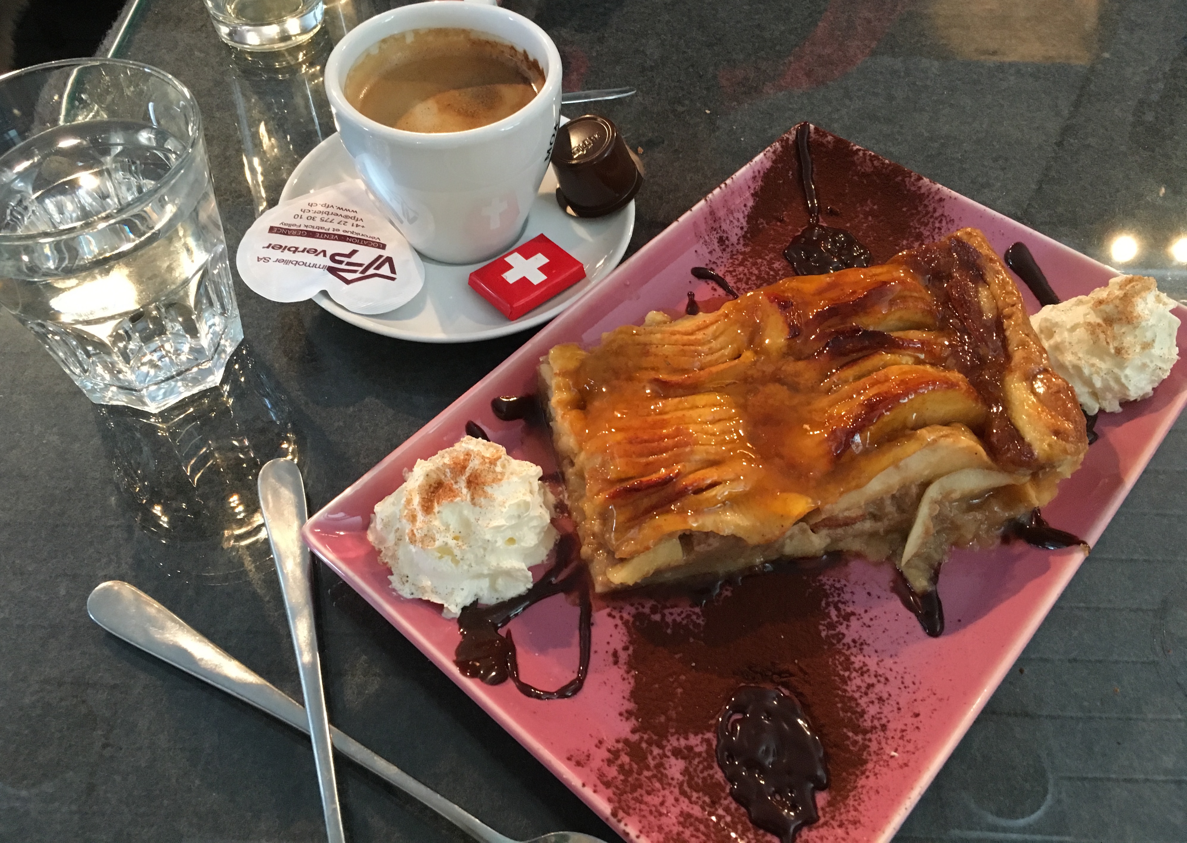 Then we ordered an apple pie and shared it. It was great! The chocolate sauce on the side was very tasty and went very well with the apple. That made me very happy and put the smile back on my face! I’ve got my energy back and I jumped on my skis …